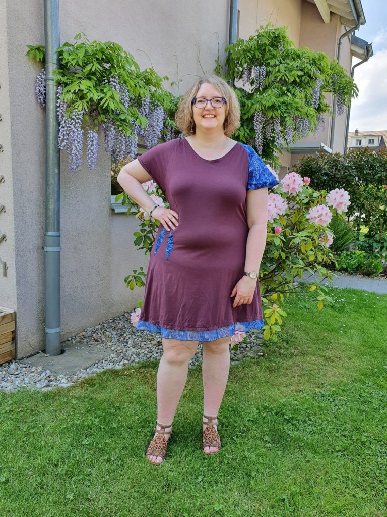 L’autre possibilité avec des petits foulards, c’est de les utiliser comme tissus pour les intégrer dans une création Crocus, comme nous l’avons fait avec une de mes cliente, Evelyne. Son foulard allongé bleu a servi pour la manche, le motif et le bandeau d’ourlet de la belle robe Patch’Mode. Voici ce qu’elle en pense: