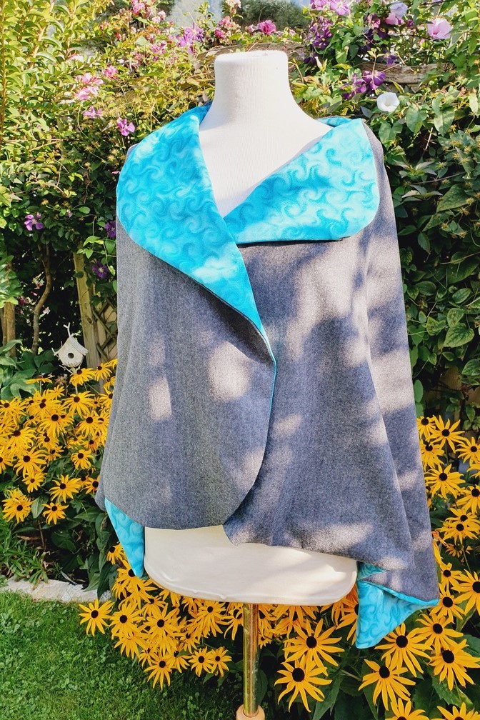 Jouez avec les revers du col qui se forment lorsque vous la fermez, pour rajouter plus ou moins de la couleur, en laissant apercevoir la belle couleur bleue de la doublure, ou ouverte comme un grand châle. Cette pièce est unique.