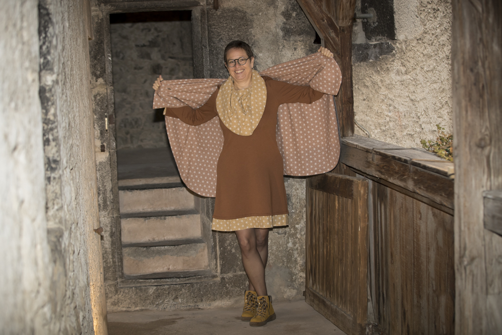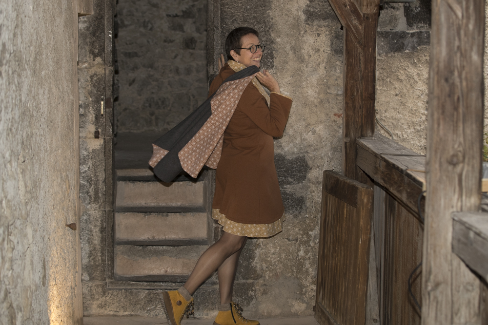 Cette cape est parfaite pour ajouter une couche supplémentaire à votre tenue, couvrir vos épaules pour éviter des courants d’air ou apporter la chaleur qui vous manque avec son lainage et son coton à l’imprimé étoilé rappelant l’anis. Jouez avec les revers du col qui se forment lorsque vous la fermez, pour rajouter plus ou moins de la couleur, en laissant apercevoir la belle cotonnade aux tons à choix, ou ouverte comme un grand châle.