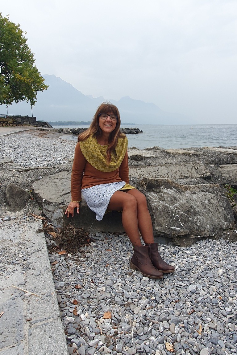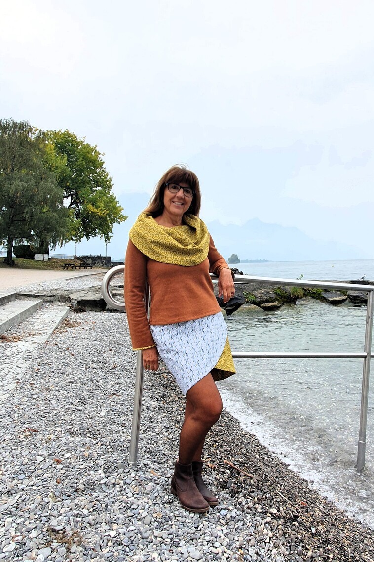 Il fait froid dehors, on est bien qu’à la maison. Avec ce pull, douceur et chaleur vous envelopperont tel un plaid douillet grâce à son jersey moelleux, épais et agréable et son large col à l’imprimé élégant avec des paons stylisés ou des cercles en écailles. Ce modèle fait partie de la collection capsule Paon, et a pour but que chaque jour soit chaud, douillet et plaisant. Son col, contrastant avec l’uni du jersey, s’ajuste sur les épaules ou “tombe” sur la poitrine selon votre préférence.