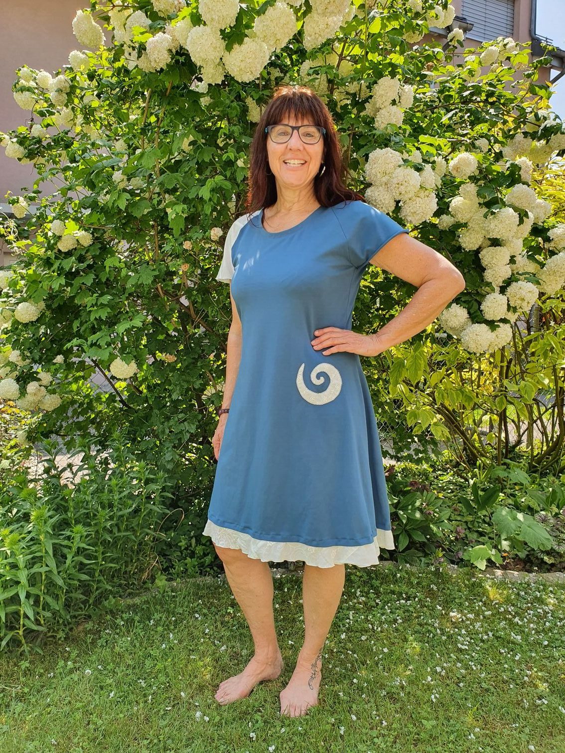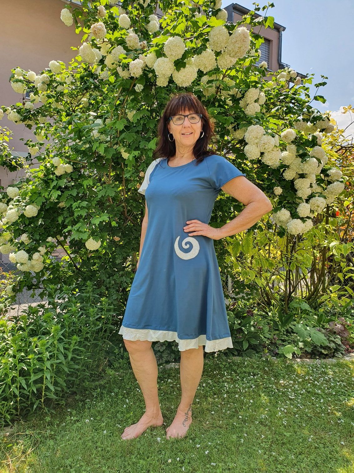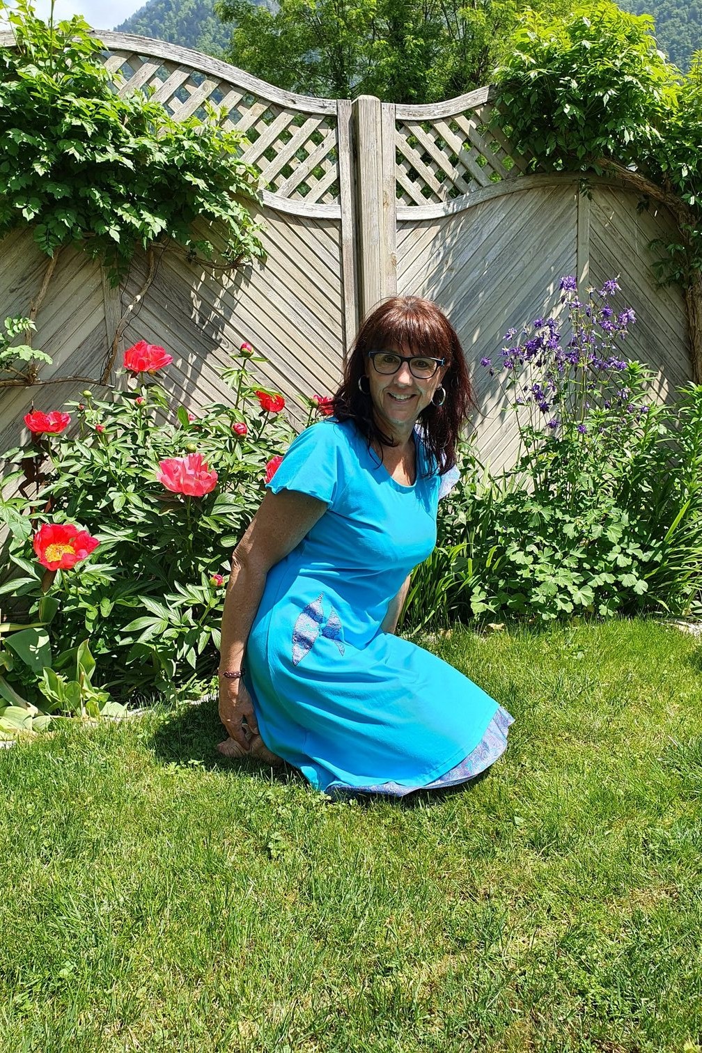 Cette robe pourra vous accompagner au quotidien par sa coupe confortable, ou pour une soirée décontractée entre amis, tout en apportant une vivacité et une sentimentalité si féminine grâce aux magnifiques soies venant de mon voyage en Thaïlande ou de belles broderies anglaises, rehaussant la belle qualité du jersey uni.