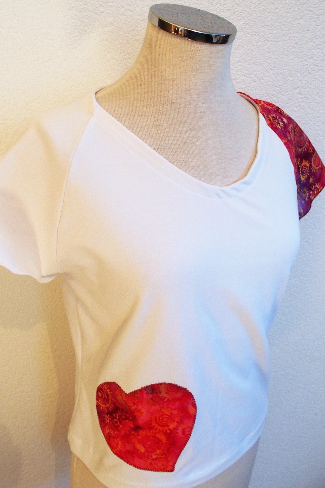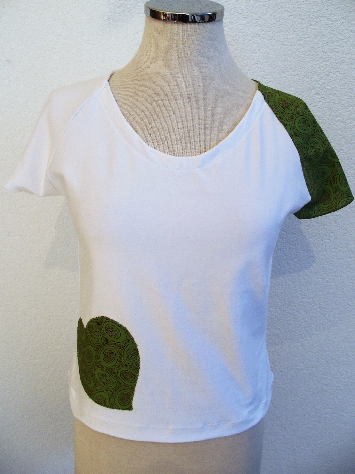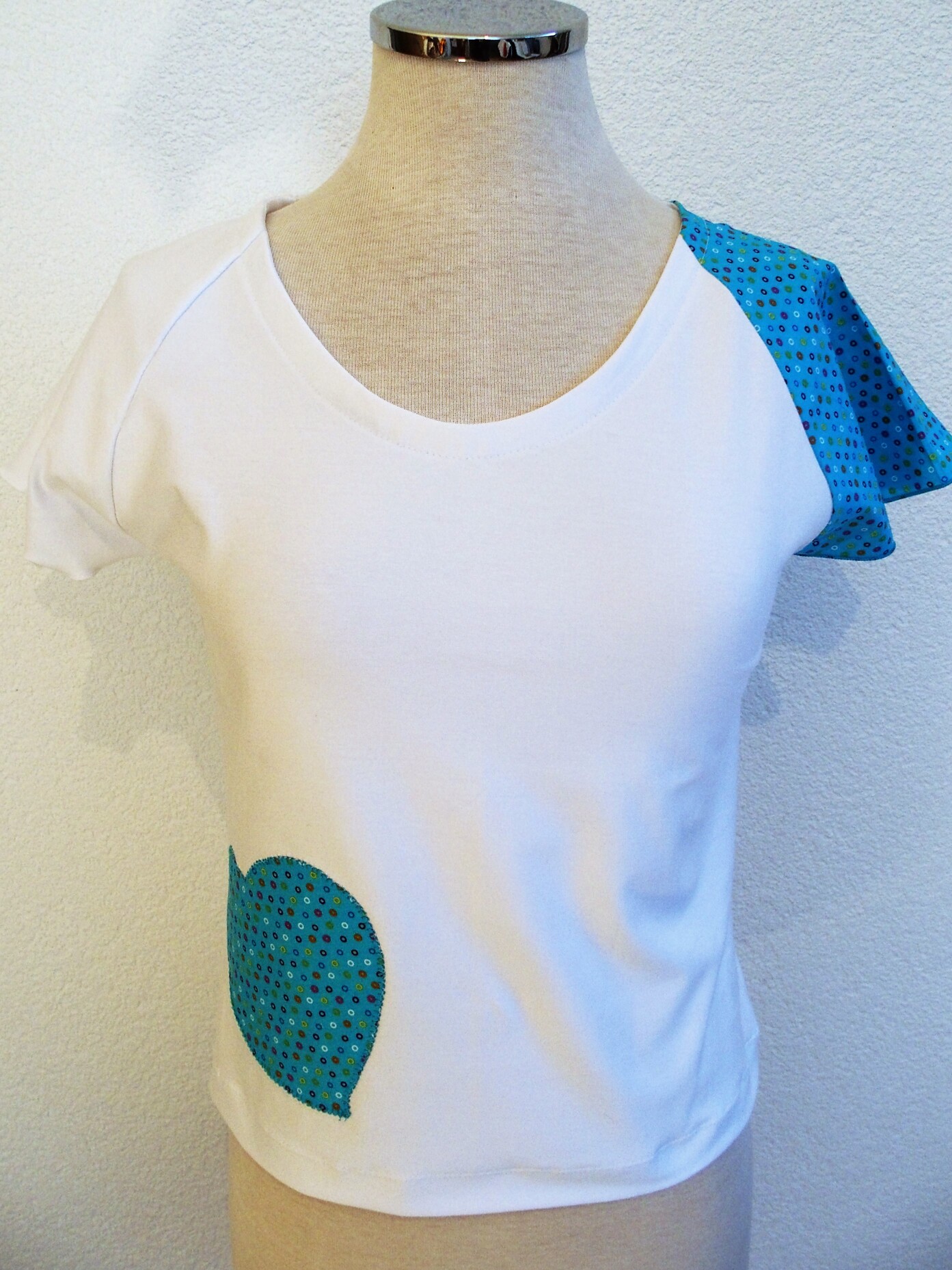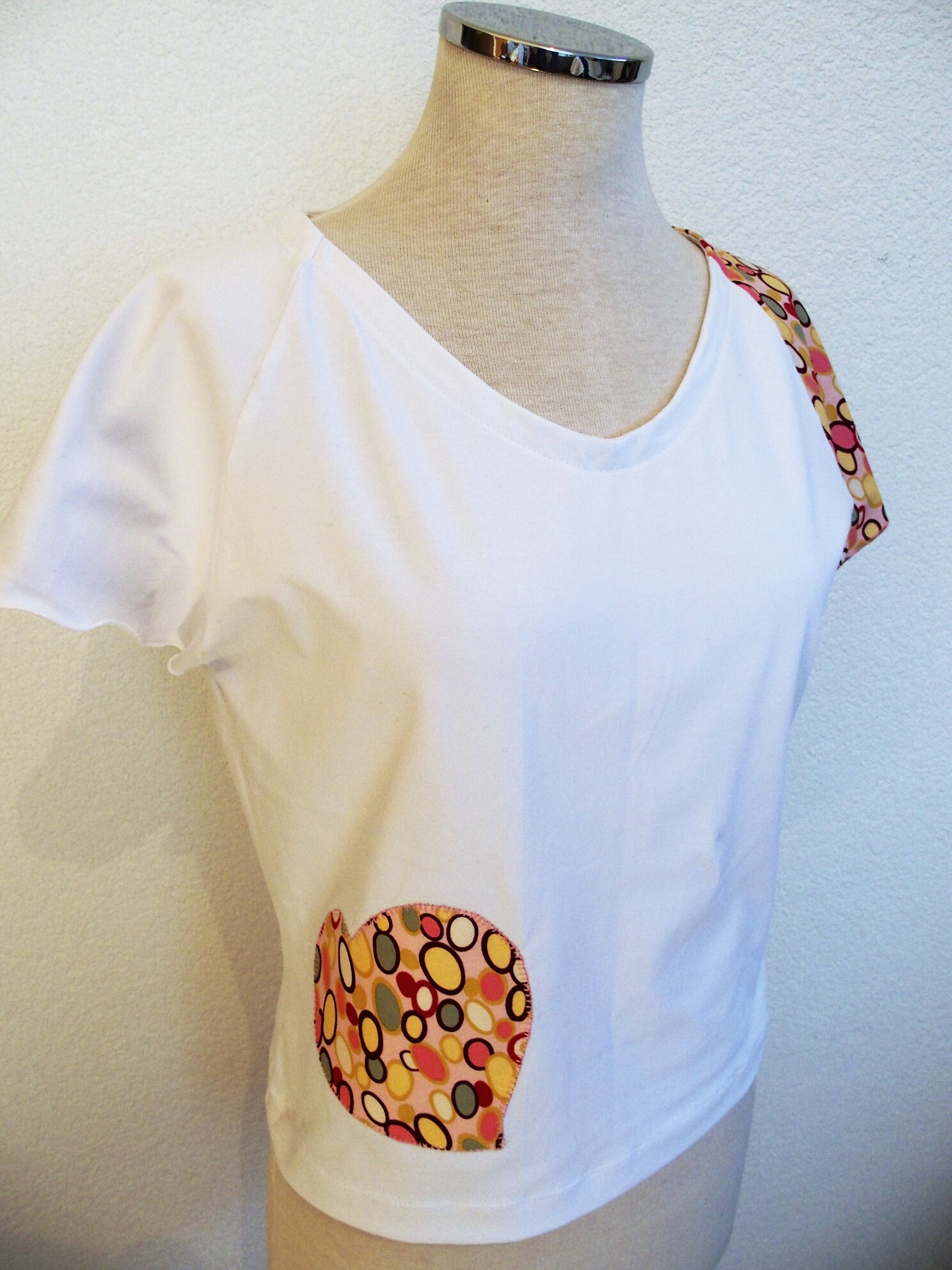 Il se veut simple, pour tous les jours, à porter de façon décontractée avec un jeans, une jupe ou un pantalon, étant sobre tout en amenant une touche fantaisie avec la manche et le motif réalisés dans des cotonnades aux imprimés joyeux et géométriques, aux couleurs vives ressortant sur le jersey de coton blanc.