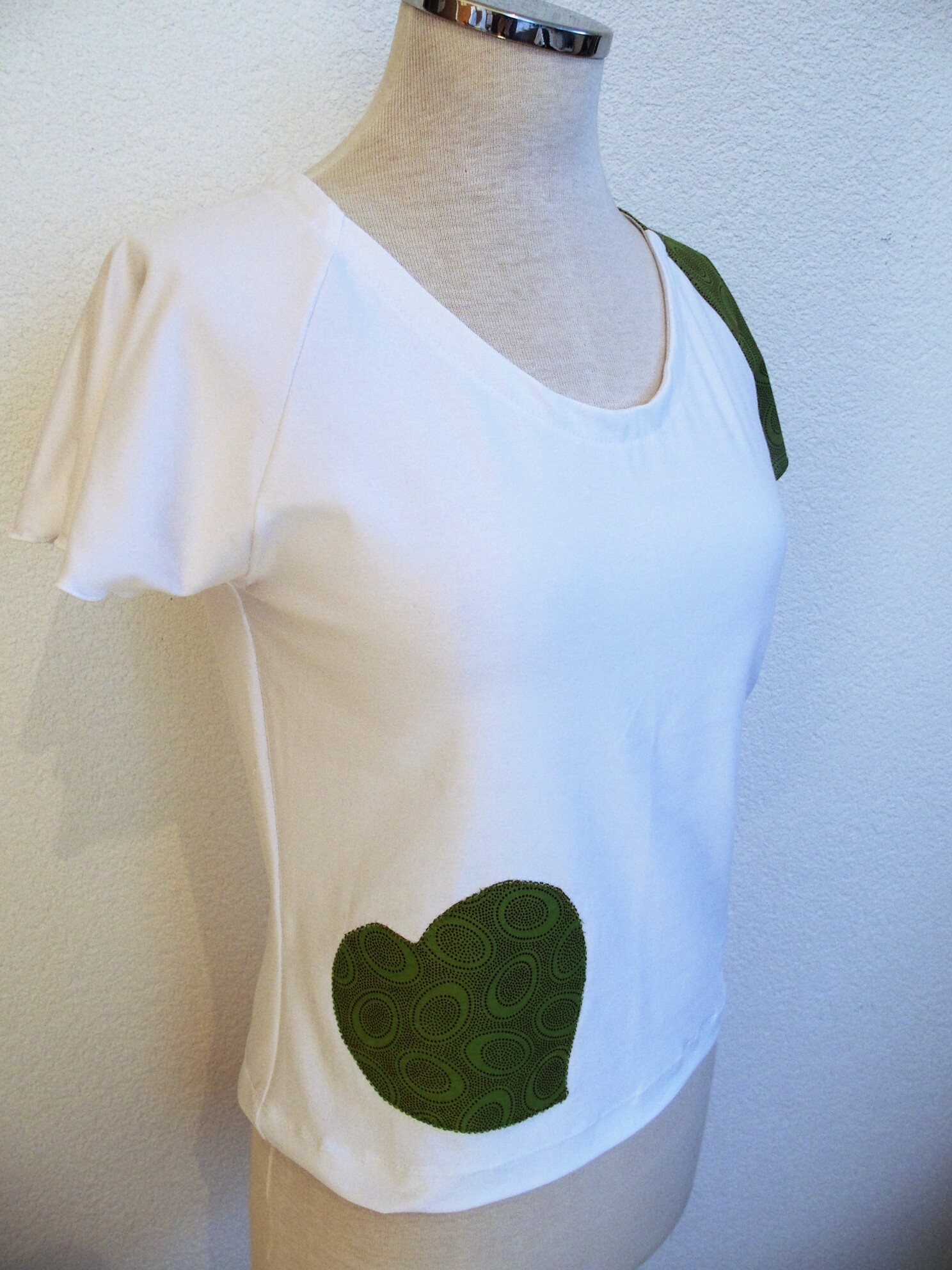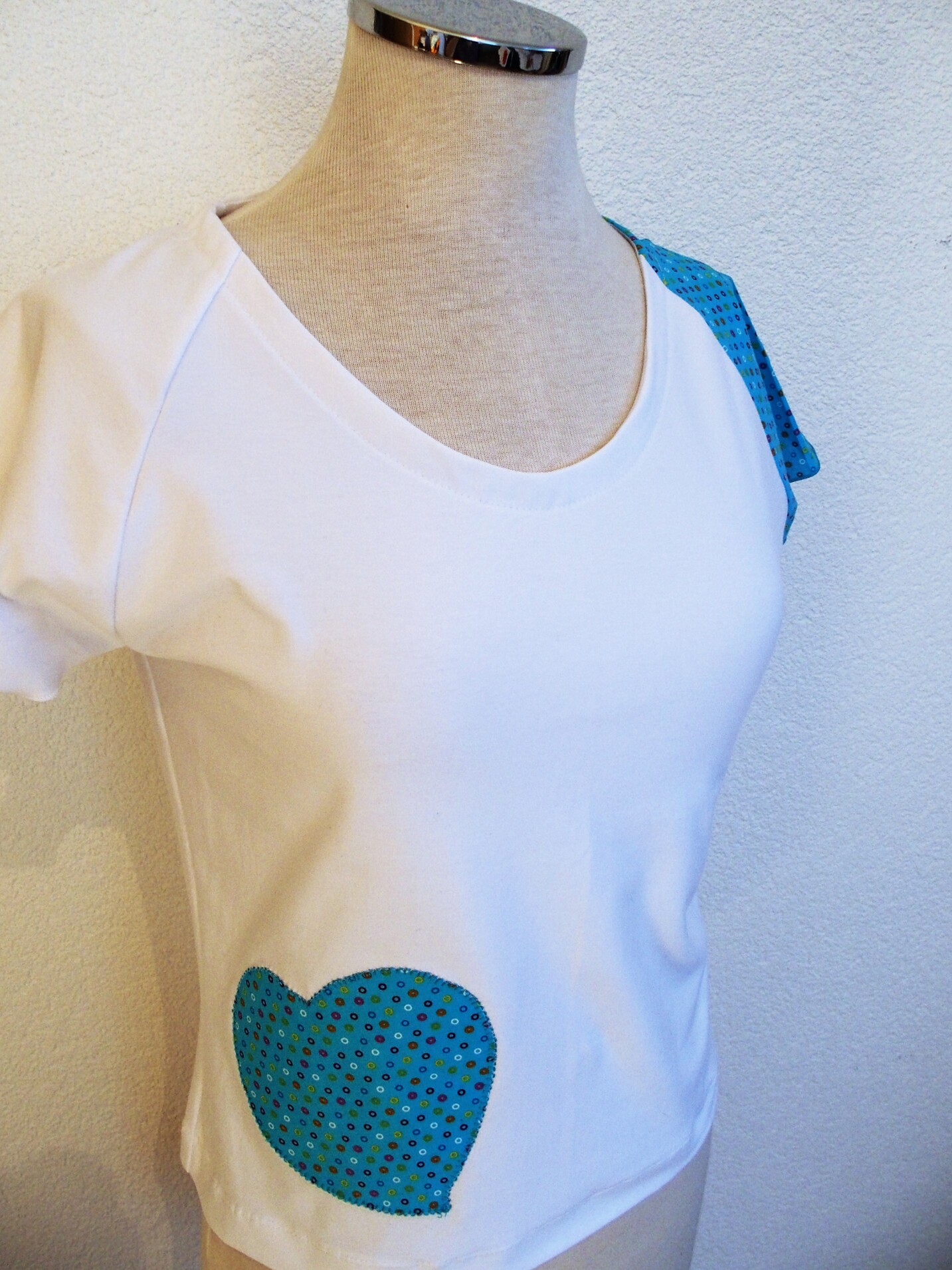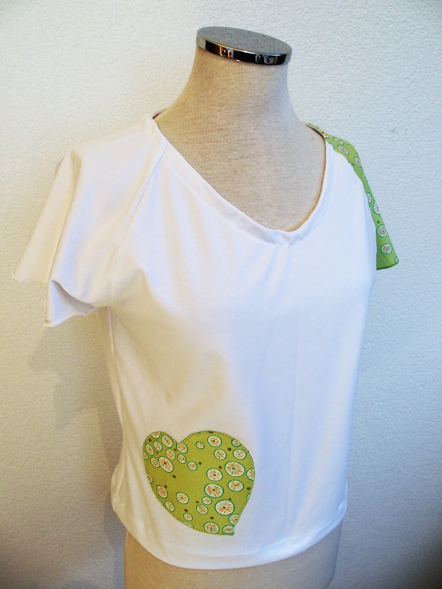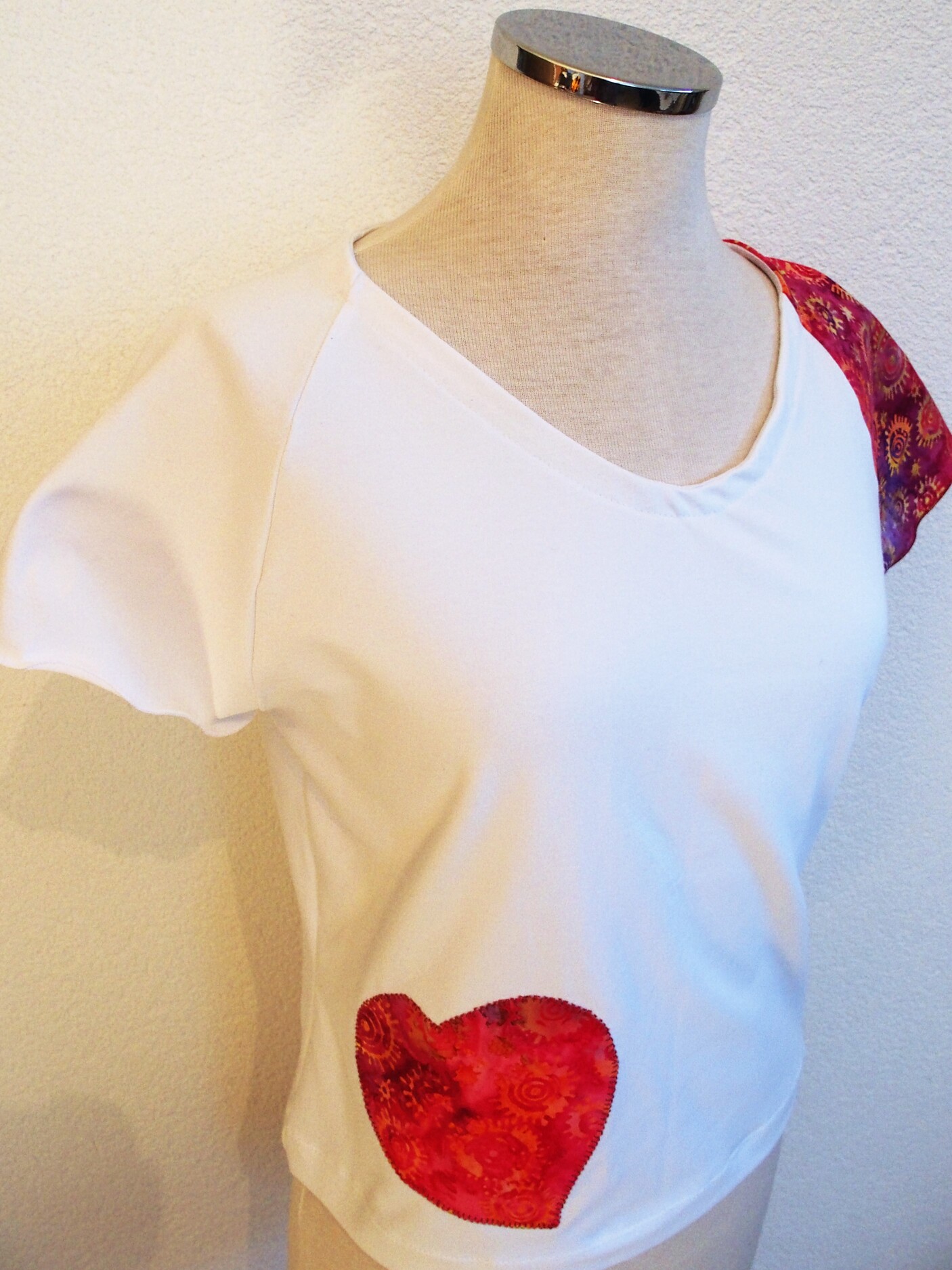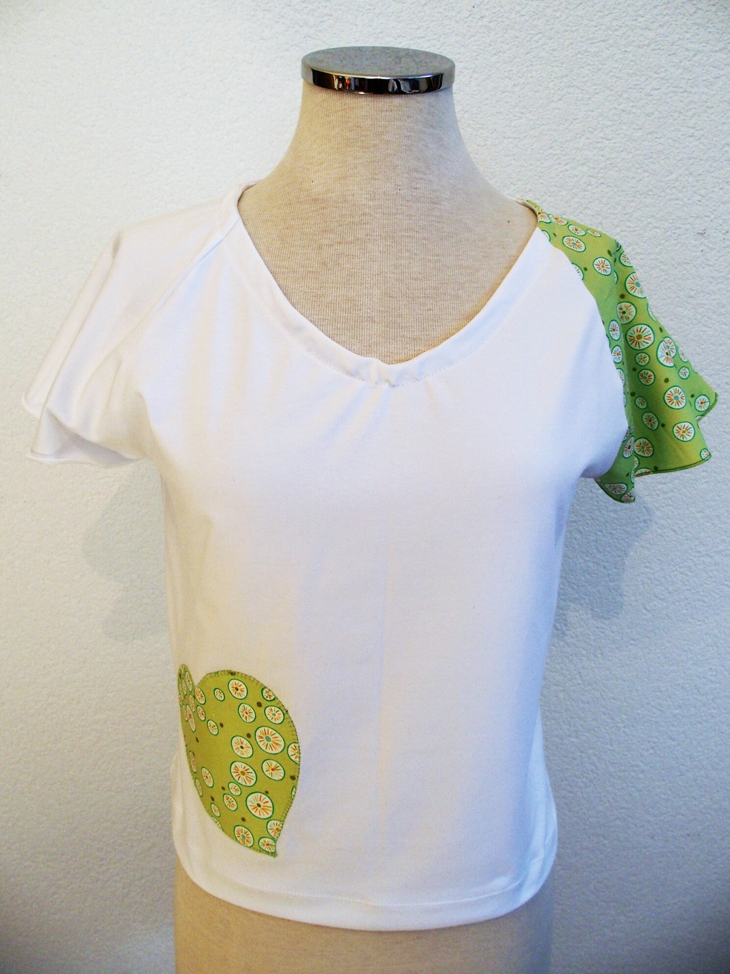 Il se veut simple, pour tous les jours, à porter de façon décontractée avec un jeans, une jupe ou un pantalon, étant sobre tout en amenant une touche fantaisie avec la manche et le motif réalisés dans des cotonnades aux imprimés joyeux et géométriques, aux couleurs vives ressortant sur le jersey de coton blanc.