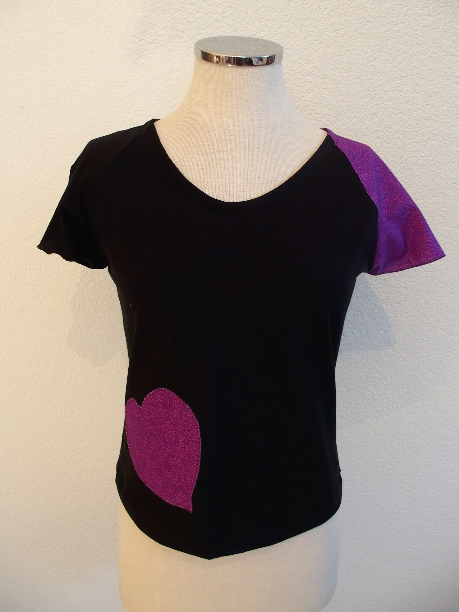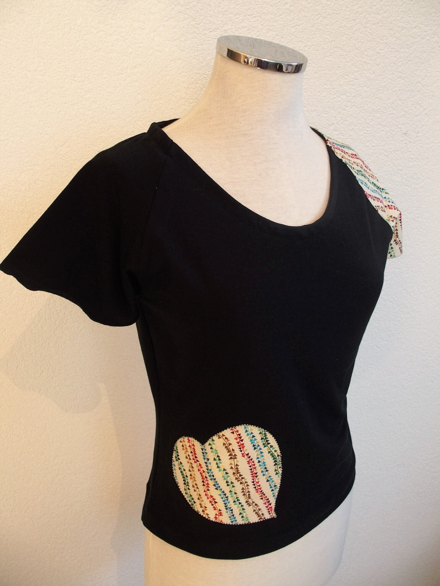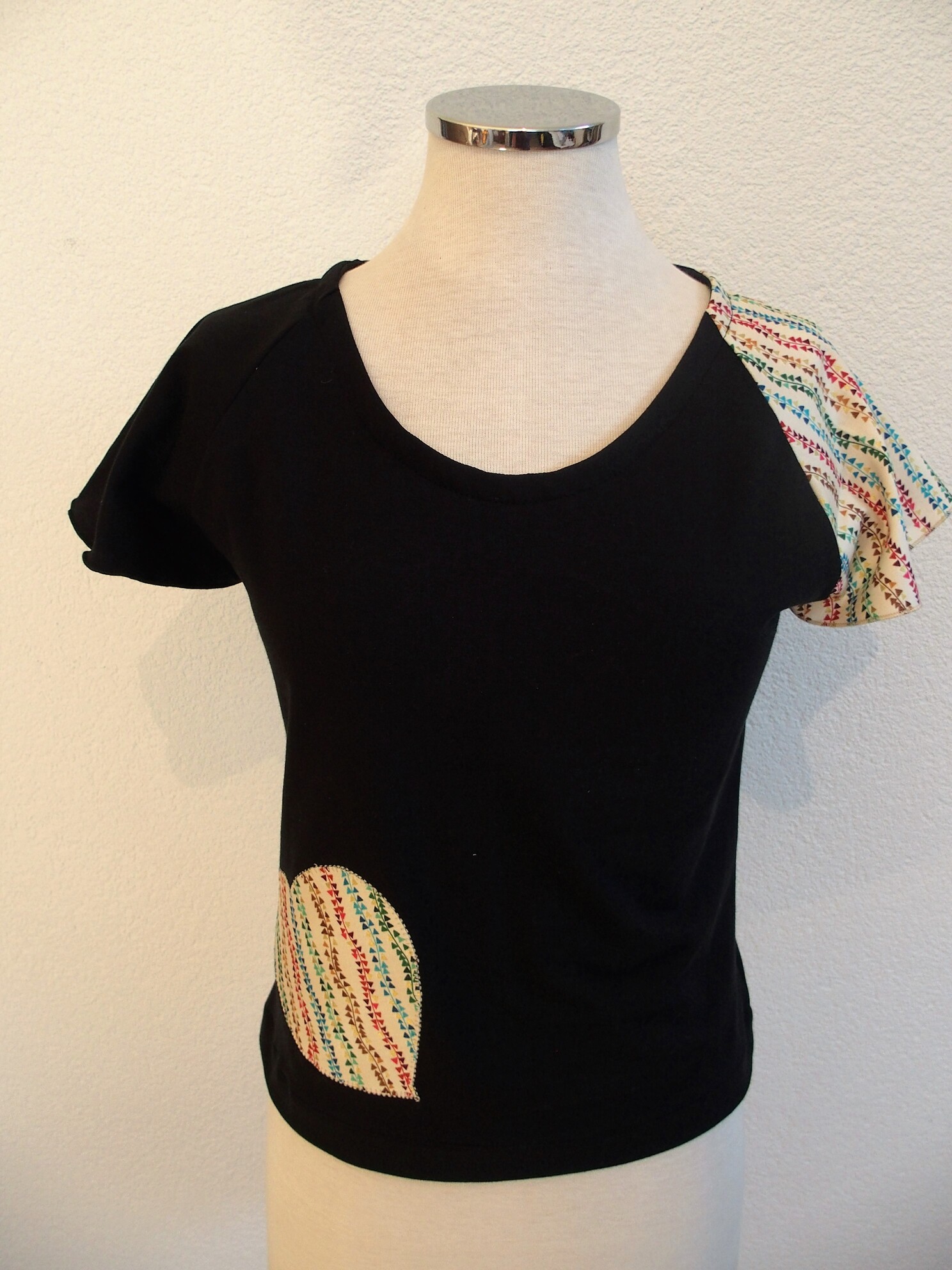 Il se veut simple, pour tous les jours, à porter de façon décontractée avec un jeans, une jupe ou un pantalon, étant sobre tout en amenant une touche fantaisie avec la manche et le motif réalisés dans des cotonnades aux imprimés joyeux et géométriques, aux couleurs vives ressortant sur le jersey de coton noir.