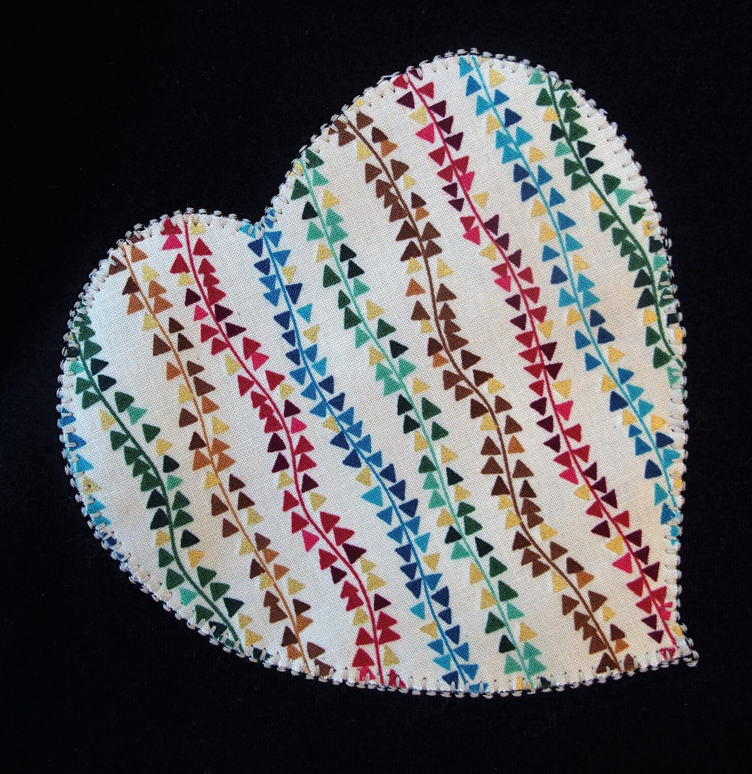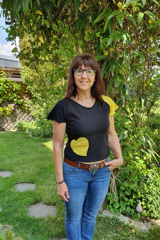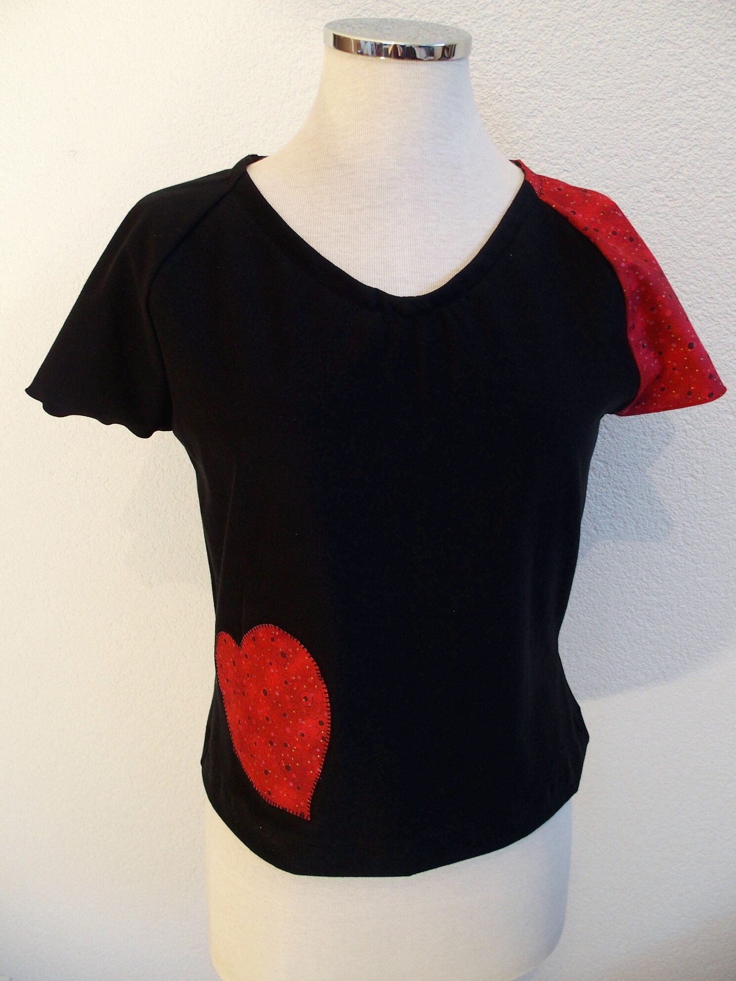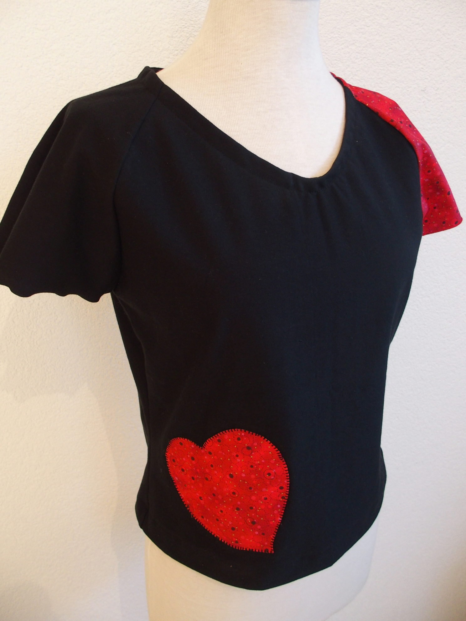 Il se veut simple, pour tous les jours, à porter de façon décontractée avec un jeans, une jupe ou un pantalon, étant sobre tout en amenant une touche fantaisie avec la manche et le motif réalisés dans des cotonnades aux imprimés joyeux et géométriques, aux couleurs vives ressortant sur le jersey de coton noir.